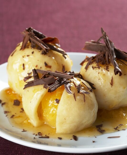• Knedlíky vložíme do velkého hrnce s vroucí lehce osolenou vodou a zvolna vaříme. Jakmile knedlíky vyplavou na hladinu, vaříme ještě asi 1 minutu, pak je vyjmeme děrovanou naběračkou, rozdělíme na talíře, přelijeme omáčkou a posypeme nastrouhanou čokoládou.